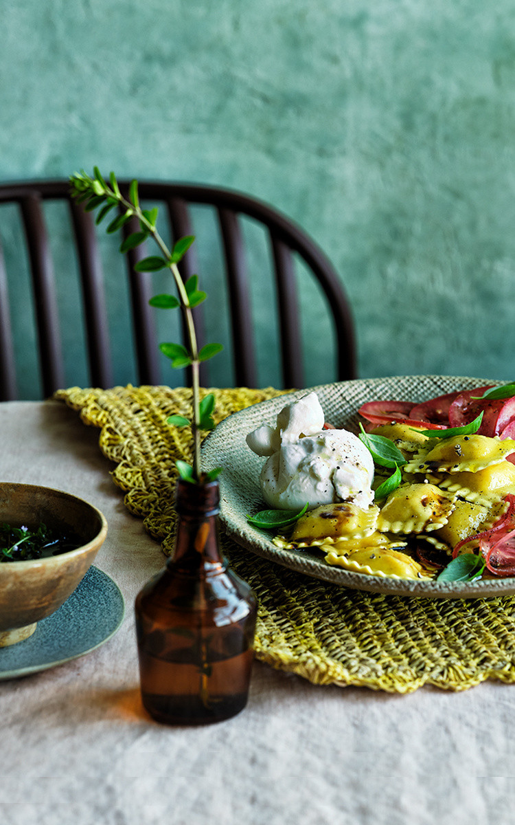 Riv burrataen i stykker og fordel den over ravioli og tomater.